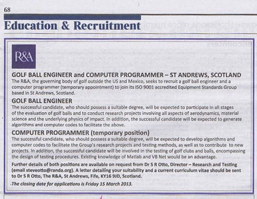/Nice spot by Ben Stephens to post the job ad on GolfClubAtlas.com. Currently, the USGA handles ball testing for the two governing bodies. Does this mean the R&A would like to do its own testing at headquarters in St. Andrews?